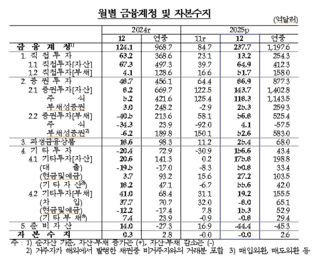 금융계정 순자산(자산-부채)은 12월 중 237억7,000만 달러 불었다.