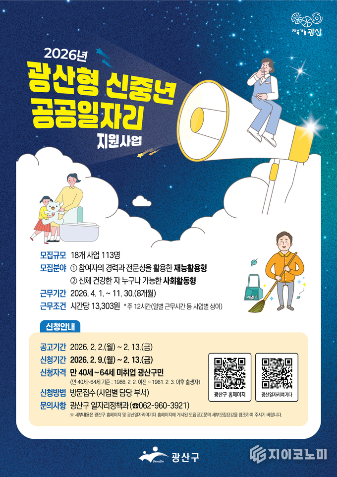 신청 기간은 9일부터 13일까지 각 일자리 담당 부서에 방문하면 되며, 공공일자리 관련한 자세한 사항은 광산구 누리집이나 광산구 일자리 통합플랫폼(광산 일자리 여기다) 누리집에서 확인할 수 있다.