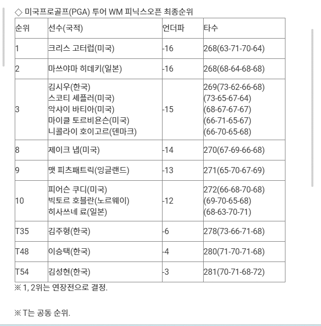 세계 랭킹 1위 스코티 세플러(미국)는 이날 하루에만 7타를 줄이는 저력을 발휘해 김시우와 함께 공동 3위로 대회를 마쳤다.