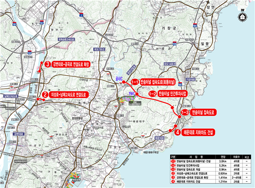 4개 사업은 총 6천539억 원 규모로, ▲반송터널 ▲해운대로 지하차도 건설▲의성로~남해고속도로 연결도로 ▲강변대로~금곡로 연결도로 확장 사업이다.