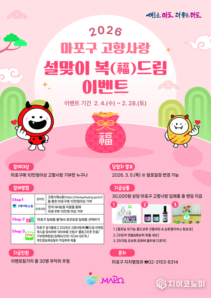 지이코노미 최영규 기자 | 마포구(구청장 박강수)는 설 명절을 맞아 고향사랑기부제 참여를 확대하고 기부 문화를 확산하기 위해 ‘2026년 설맞이 고향사랑 복(福)드림 이벤트’를 2월 4일부터 28일까지 운영한다.