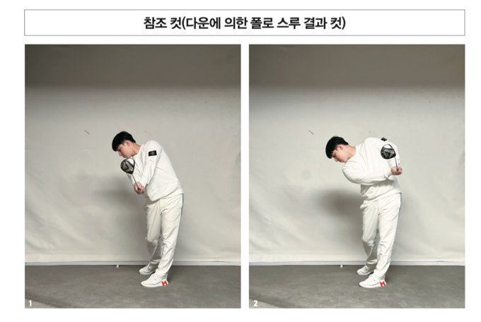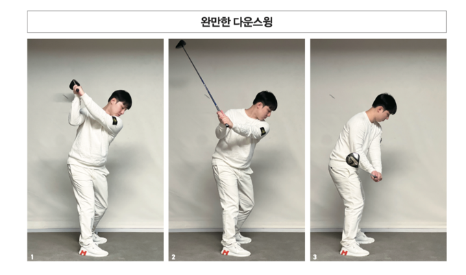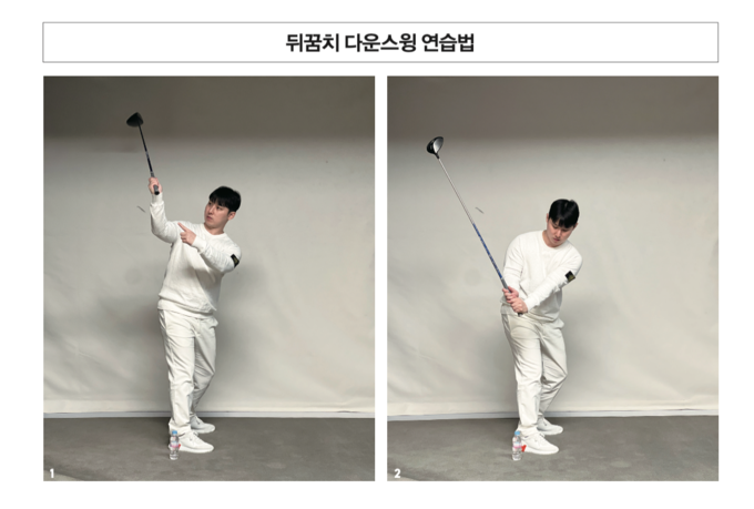 향해 바로 출발하는 것이 아니라, 오른발 뒤쪽으로 떨어지는 느낌으로 다운스윙을 시작해보자.