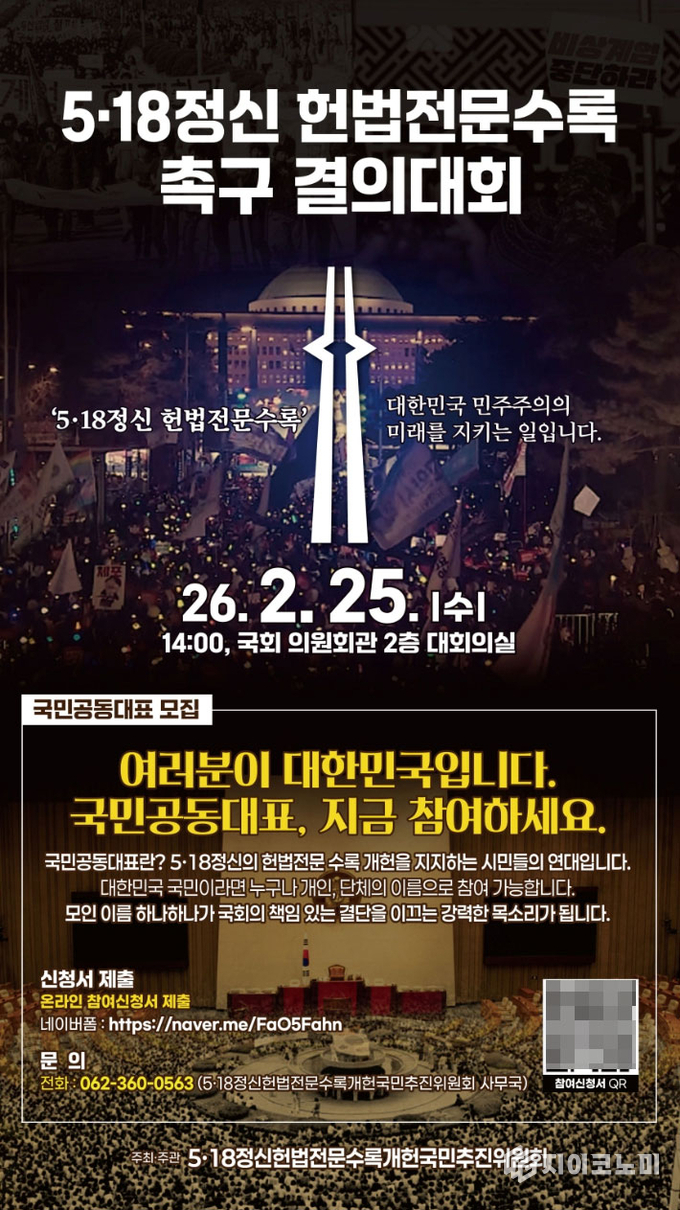 지이코노미 김정훈 기자 | 5·18 정신의 헌법 전문 수록을 촉구하는 국민결의대회가 25일 국회에서 열린다.