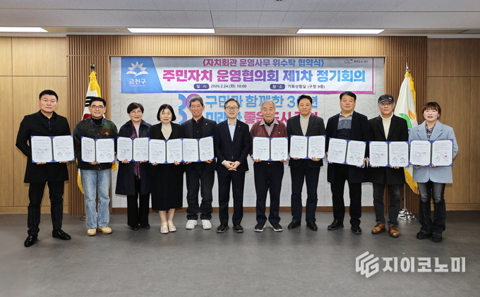 지이코노미 최영규 기자 | 금천구(구청장 유성훈)는 2월 24일 구청 기획상황실에서 10개 동 주민자치회와 ‘2026~2027년 자치회관 운영 위·수탁 협약’을 체결했다고 밝혔다.