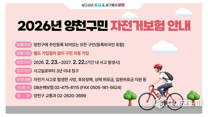 지이코노미 최영규 기자 | 양천구(구청장 이기재)는 일상 속 예기치 못한 사고로부터 구민의 든든한 울타리가 되어주고 있는 ‘구민안전보험’과 ‘구민 자전거보험’ 지원 사업을 올해도 이어간다고 3일 밝혔다. 보험료는 전액 구가 부담하며, 약 44만 모든 구민은 별도 절차 없이 1년간 자동 가입된다.