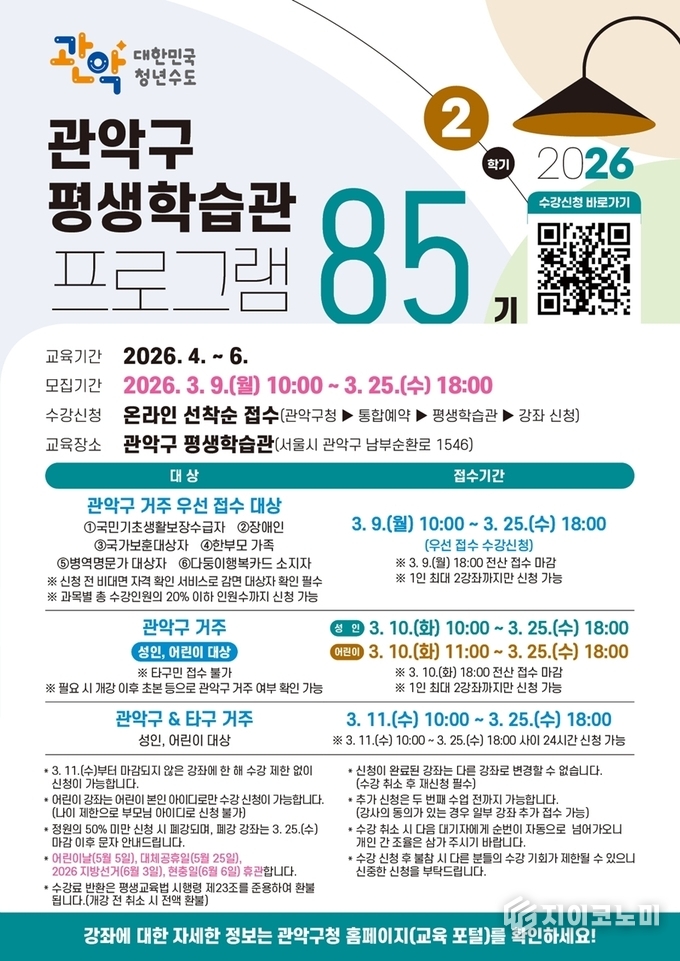 신청 일정은 대상별로 순차 진행된다. ▲3월 9일은 관악구 거주 사회적 배려 대상자 ▲3월 10일은 일반 관악구민 ▲3월 11일은 타 지역 주민 순으로 접수한다. 11일 이후부터 25일까지는 미달 강좌에 한해 누구나 선착순으로 신청할 수 있다.