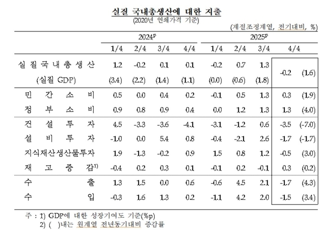 다만 속보치에 포함되지 못한 작년 12월 경제 통계가 반영되면서, 4분기 성장률은 -0.3%에서 -0.2%로 상향 조정됐다.