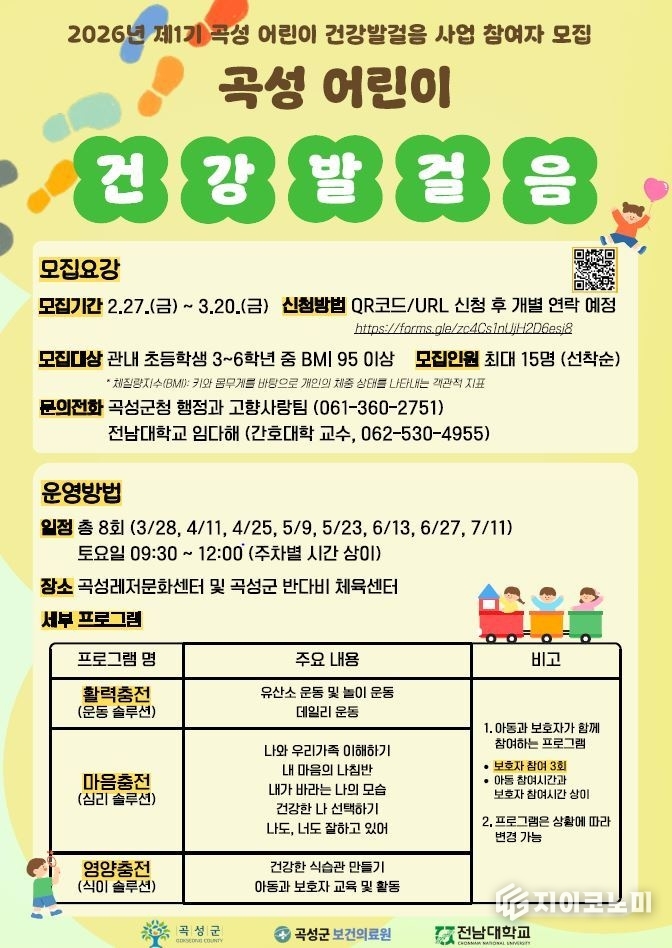 곡성군은 어린이 건강 증진을 위해 ‘2026년 제1기 곡성 어린이 건강발걸음 사업’ 참여자를 20일까지 모집한다.