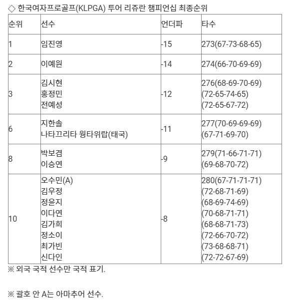 최종 합계 15언더파 273타를 기록한 임진영은 이예원을 1타 차로 제치고 우승했다.