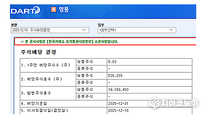 지이코노미 유주언 기자 | 영풍이 일부 언론이 보도한 ‘주당 5원 배당’ 보도에 대해 사실 왜곡이라고 반박하며 민·형사상 법적 대응을 예고했다. 회사 측은 올해 결산배당의 핵심은 주식배당이며 현금배당은 주주의 세금 부담을 보완하기 위한 조치라고 설명했다. 주식과 현금을 합산한 실제 배당 규모는 약 3% 수준으로, 단순히 ‘현금 5원’만을 강조한 보도는 전체 배당 구조를 의도적으로 배제한 것이라고 주장했다.