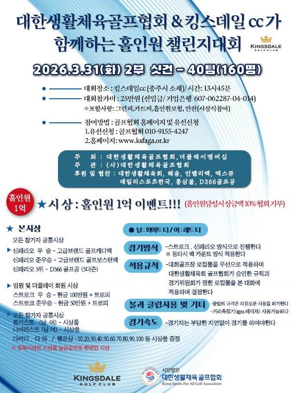 대한생활체육골프협회장배 1억 원 홀인원 챌린지대회가 오는 31일 오후 1시45분부터 충북 충주시 소재 킹스데일CC에서 열린다.