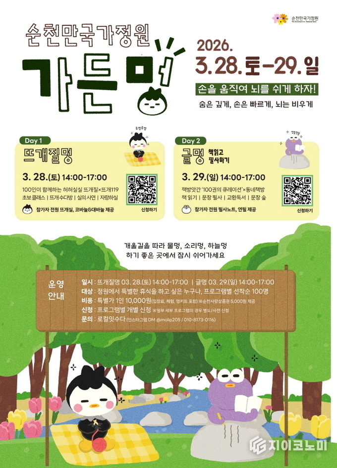 17일 순천시에 따르면 ‘가든멍’은 오는 28일부터 29일까지 이틀간 순천만국가정원 개울길 광장 일원에서 열린다. 정원을 배경으로 손을 움직이며 마음을 비우는 방식의 ‘능동형 쉼’을 주제로 기획됐다.