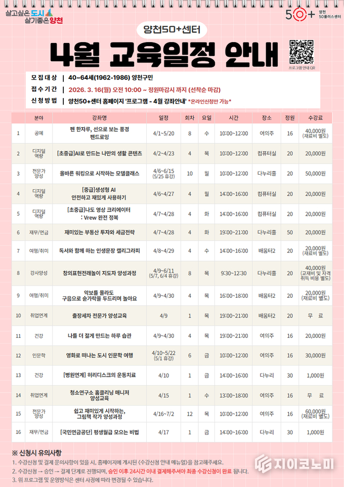 양천50플러스센터 4월 강좌 수강생 모집기간은 3월 16일 오전 10시부터 정원 마감 시까지이며, 중장년을 대상으로 모집하되 양천구 거주자와 만 40~64세에게 우선 선발 기회가 제공된다. 자세한 교육 일정과 신청은 양천50플러스센터 홈페이지에서 확인할 수 있다.