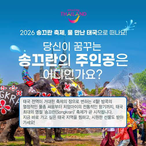 지이코노미 정경임 기자 | 태국 전역이 거대한 축제의 장으로 변하는 4월, 태국 최대 명절 ‘송끄란(Songkran)’을 앞두고 특별한 온라인 이벤트가 열린다. 태국정부관광청 서울사무소는 2026년 송끄란 축제를 기념해 공식 페이스북을 통해 참여형 이벤트를 진행한다고 밝혔다. 이벤트 기간은 3월 18일부터 29일까지다.