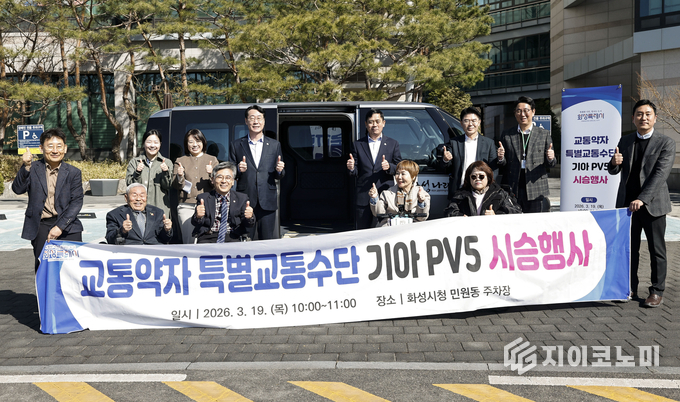 지이코노미 최영규 기자 | 화성특례시(시장 정명근)가 교통약자의 이동 편의를 개선하기 위해, 교통약자 전용 모델로 제작된 ‘기아 PV5(휠체어 이용자 탑승 모델)’를 전국 최초로 도입한다. 시는 정식 운행에 앞서 19일 화성시청에서 휠체어 이용 교통약자들과 함께 차량의 편의성과 안전성을 점검하는 시승 행사를 열었다.