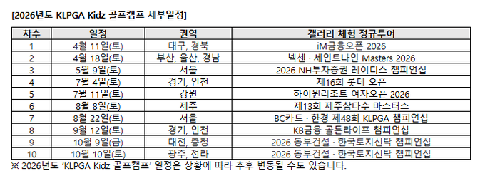유소년 골프 저변 확대와 골프 대중화를 위해 ‘KLPGA Kidz 골프캠프’는 전국 8개 권역에서 총 10개 차수로 운영되며, 각 차수마다 선착순 30명을 모집해 총 300명의 골프 유소년이 참가할 수 있다.