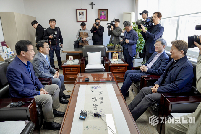 지이코노미 김정훈 기자 | 강기정 민주당 전남광주통합특별시장 예비후보가 신정훈 후보와 함께 23일 오후 천주교 광주대교구를 찾아 옥현진 대주교를 예방했다.