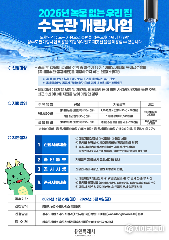 지이코노미 최영규 기자 | 용인특례시(시장 이상일)는 오는 5월 8일까지 ‘녹물 없는 우리 집 수도관 개량사업’ 참여 가구를 모집한다고 24일 밝혔다.