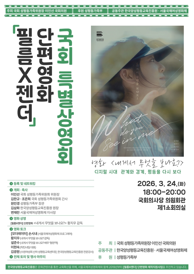 지이코노미 양하영 기자 | 성평등가족부 산하 한국양성평등교육진흥원(원장 김삼화, 이하 양평원)은 24일 오후 6시 국회에서 단편영화 제작지원 사업인 [필름X젠더]의 국회 특별상영회를 개최했다고 밝혔다.