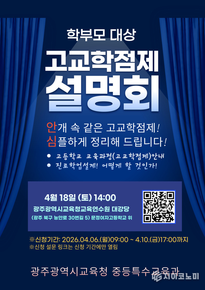 지이코노미 한정완 기자 | 광주시교육청은 오는 18일 광주교육연수원 대강당에서 중학교 3학년 및 고등학교 1학년 학부모를 대상으로 ‘고교학점제 설명회’를 개최한다.