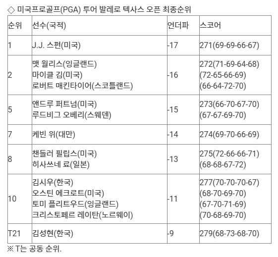 우승은 최종 합계 17언더파 271타를 친 J.J. 스펀(미국)이 차지했다.