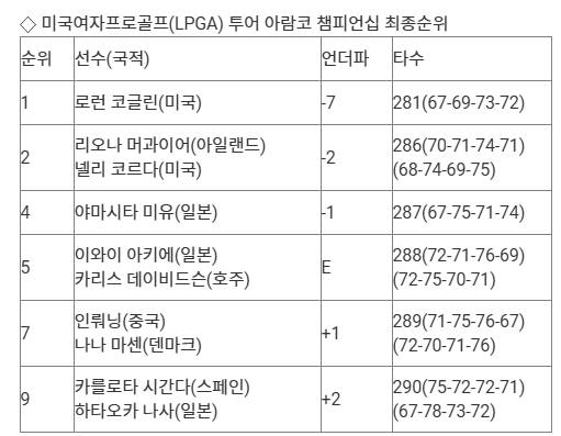 코글린은 이날 이븐파를 기록하며 공동 2위 넬리 코다(미국), 리오나 머과이어(아일랜드·이상 2언더파 286타)를 5타 차로 따돌리고 우승 트로피를 들어 올렸다. 우승 상금은 50만 달러(약 9억 원)다.