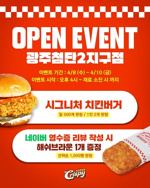 한편 슈퍼크리스피 광주첨단2지구점은 4월 8일부터 10일까지 3일간 시그니처 치킨버거를 1,000원에 판매하며, 네이버 영수증 리뷰 작성 시 해쉬브라운 1개를 증정하는 이벤트도 함께 진행한다.