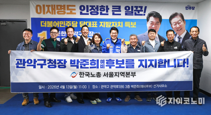 지이코노미 최영규 기자 | 한국노총 서울지역본부는 13일 오전 11시 박준희 관악구청장 예비후보 선거사무소에서 간담회를 가진 뒤 박준희 예비후보 지지를 공식 선언했다. 이번 지지선언은 관악구의 지속적인 발전과 정책의 연속성, 노동 현안에 대한 이해와 행정 경험이 필요하다는 판단에 따라 이루어졌다.