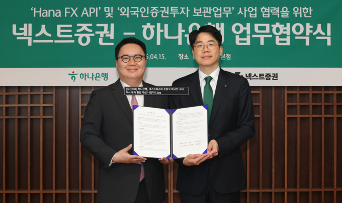 지이코노미 양하영 기자 | 하나은행이 넥스트증권과 손잡고 외국인 투자자의 국내 주식 투자 환경 개선에 나선다. 하나은행은 지난 15일 서울 을지로 본점에서 넥스트증권과 ‘외환거래(FX) 및 외국인 증권투자 보관업무(커스터디)’ 협력을 위한 업무협약(MOU)을 체결했다고 16일 밝혔다.