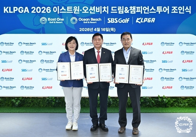 지이코노미 김대진 기자 | 한국여자프로골프협회(KLPGA)가 16일 서울 강동구 KLPGA 빌딩에서 이스트원 오션비치 골프앤리조트, SBS골프와 함께 ‘KLPGA 2026 이스트원·오션비치 드림투어·챔피언스투어’의 조인식을 개최했다.