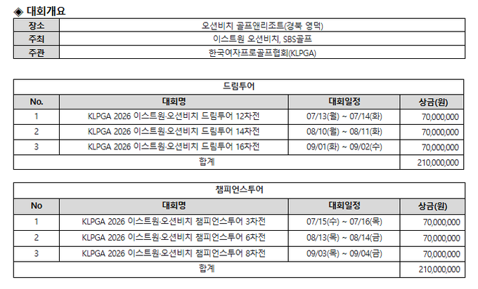 2026시즌 새롭게 선보이는 ‘KLPGA 2026 이스트원·오션비치 드림투어·챔피언스투어’는 이스트원 오션비치 골프앤리조트와 SBS골프가 주최하고 KLPGA가 주관한다. 드림투어와 챔피언스투어 각 3개씩 총 6개 대회가 개최되며, 대회당 7,000만 원의 상금이 내걸렸다.