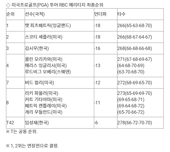 김시우는 연장전 끝에 우승을 차지한 맷 피츠패트릭(잉글랜드), 2위 스코티 세플러(미국·이상 18언더파 266타)의 뒤를 이어 단독 3위다.