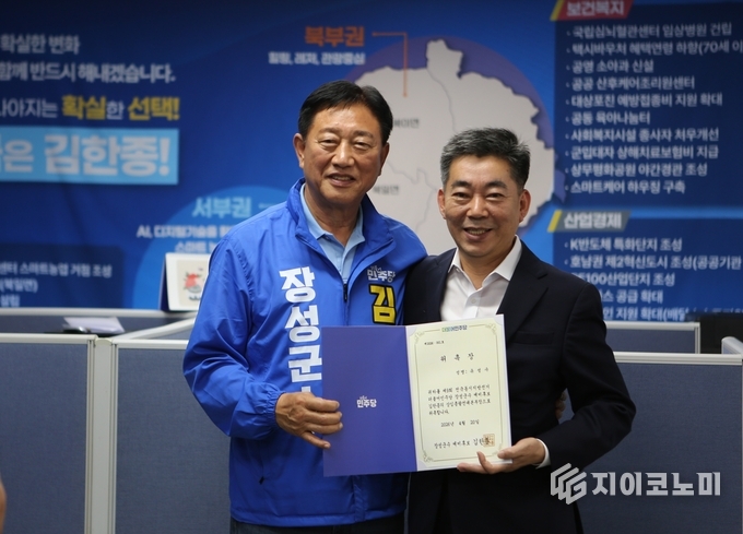 김한종 장성군수 예비후보는 20일 유성수 예비후보를 상임총괄선거대책본부장으로 위촉했다고 밝혔다. 유 예비후보는 이날 오전 11시 직을 맡겠다는 뜻을 밝히고 위촉장을 전달받았다.