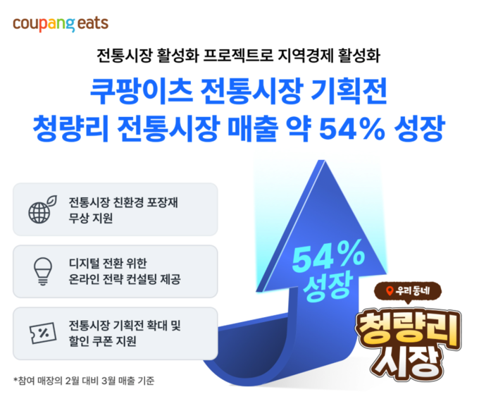쿠팡이츠는 21일 지난 3월 한 달간 청량리종합시장 내 100여개 상점이 참여한 ‘우리동네 전통시장’ 기획전을 운영한 결과, 행사 기간 입점 매장의 쿠팡이츠 매출이 2월 대비 약 54% 증가했다고 밝혔다. ‘우리동네 전통시장’ 기획전은 전통시장 소상공인의 우수 상품을 알리고 소비를 촉진하기 위해 마련된 프로젝트다. 1호 대상지로 선정된 청량리시장에는 통닭골목, 족발·보쌈골목, 순대국·해장국골목 등 대표 먹거리 매장은 물론 반찬, 과일·채소, 제철 수산물 등 장보기 매장까지 폭넓게 참여했다.