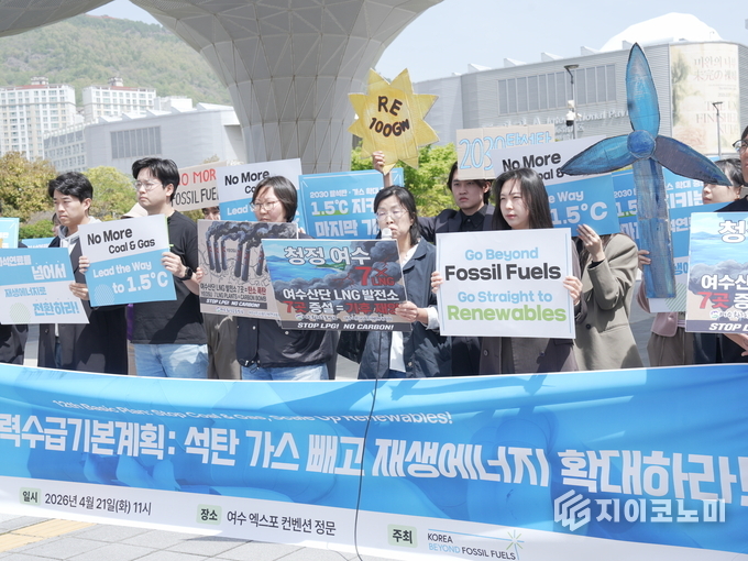 전국 탈화석연료 네트워크 ‘화석연료를넘어서’는 21일 여수 엑스포 정문 앞에서 기자회견을 열고, 석탄발전을 액화천연가스(LNG)로 전환하는 정책이 실질적인 탈탄소와 거리가 있다고 주장했다.