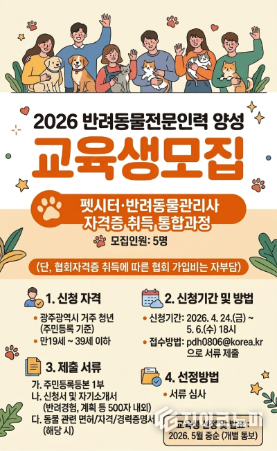 광주광역시는 24일 ‘2026년 반려동물 전문인력 양성교육’을 추진하고 교육생 모집을 시작했다고 밝혔다. 반려동물 돌봄과 훈련 분야 수요 증가에 대응해 전문성과 현장 실무를 갖춘 인재를 키우는 데 초점을 맞췄다.