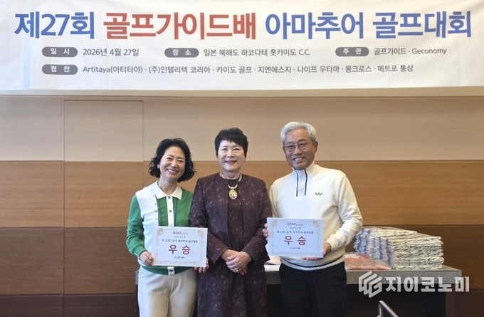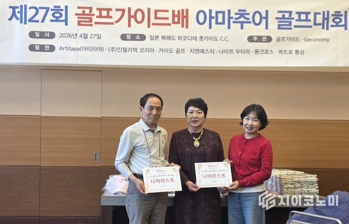 이번 대회는 경쟁의 긴장감과 여행의 즐거움, 그리고 참가자 간 교류가 어우러진 프리미엄 아마추어 골프 축제로 마무리되며 다시 한번 골프가이드배의 위상을 입증했다.제27회 골프가이드배 남여아마추어 골프대회 메달리스트 시상식에서 남자부 강희정(69타), 여자부 곽순이(81타) 수상자가 카이도골프 배우균 대표로부터 최고급 아이언 세트를 전달받고 기념촬영을 하고 있다.