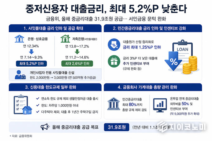 특히 제2금융권 민간중금리대출을 세분화해 기존보다 약 3%포인트 낮은 금리 상품에는 추가 인센티브를 부여한다. 저축은행의 여신비율 규제, 예대율 규제, 여전사의 자산 규제, 신협의 대출한도 규제 완화 등이 검토 대상이다.