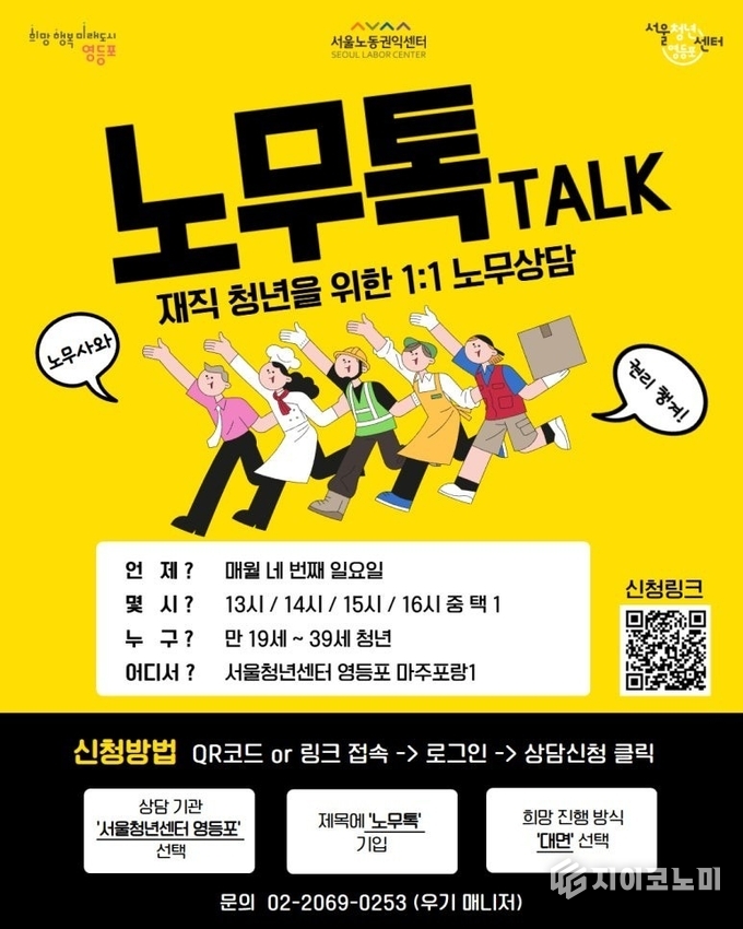 넷째 주 일요일에 진행되는 ‘노무톡(Talk)’은 청년들의 권익 보호를 위해 마련된 프로그램이다. 임금 체불, 부당 해고, 직장 내 괴롭힘 등 근로 현장에서 발생하는 고충을 전문 노무사와 1:1로 깊이 있게 상담할 수 있다. 평일에 시간을 내기 힘든 사회초년생과 아르바이트 청년들에게 든든한 버팀목이 된다.