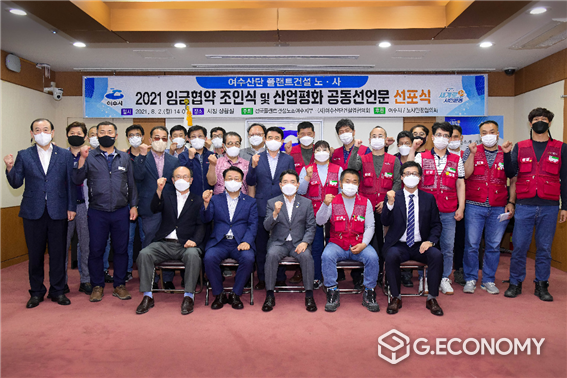 여수시에 따르면 2일 오후 시청 상황실에서 전국플랜트건설노조 여수지부 김정환 지부장과 여수산단건설업협의회 김경수 회장을 비롯해 권오봉 여수시장, 여수상공회의소 이용규 회장, 김태영 고용노동부여수지청장 등 25명이 참석한 가운데 조인식과 공동선언문 선포식이 열렸다.