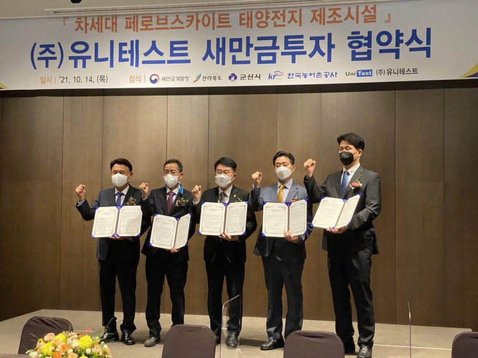 ㈜유니테스트는 이번 협약을 통해 새만금산단 1공구 66천㎡(2만평)에 2024년까지 1,213억원을 투자해 페로브스카이트 태양전지 제조공장을 건립하고 300여 명의 인력을 고용할 계획이다.
