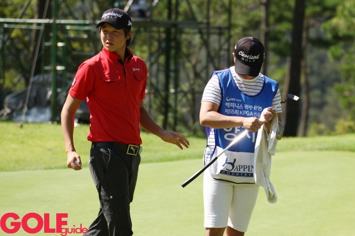 KPGA 선수권대회 2라운드 16번홀에서 양지호선수 캐디가 열심히 골프채를 닦고 있다.