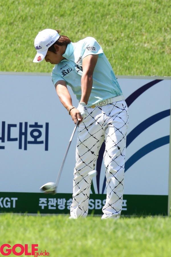 KPGA 선수권대회 2라운드 1번홀에서 김승혁이 이를 ‘악!’ 물고 티샷을 하고 있다.