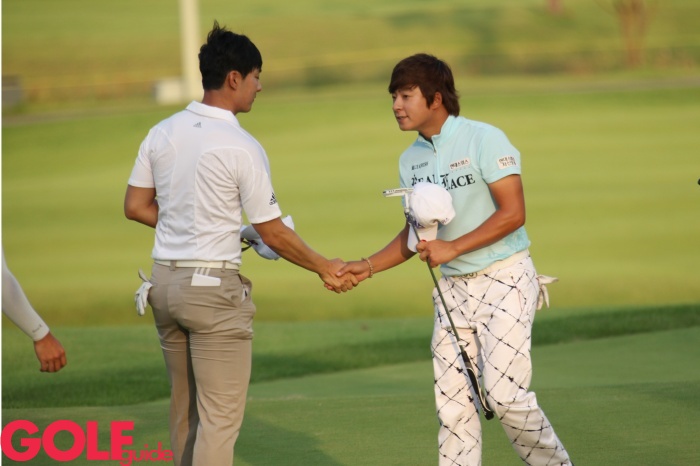 KPGA 선수권대회 2라운드 18번홀에서 홍순상,김승혁이 경기가 끝나고 격려하며 악수하고 있다.
