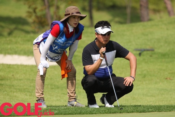 KPGA 선수권대회 2라운드 17번홀에서 미모의 캐디와 박도규가 퍼팅 마커를 확인 하고 있다.