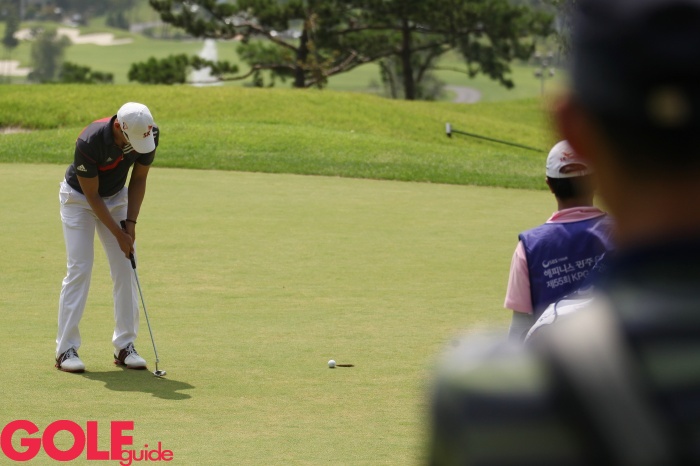 KPGA 선수권대회 2라운드 1번홀에서 갤러리가 지켜보는 가운데 홍순상이 그린위에서 퍼팅을 하고 있다.