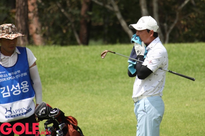 KPGA 선수권대회 2라운드 7번홀에서 김성용이 더위에 지쳐 얼굴을 닦고 있다.
