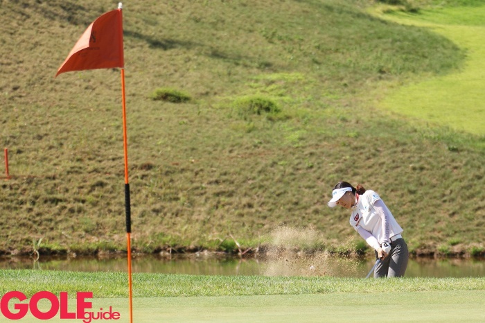 6일, 국내 역대 최고의 상금이 걸린 KLPGA 메이저대회 `2012 한화 금융 클래식(총상금12억, 우승상금 3억)’ 이 충남 태안의 골든베이CC (파72 / 6,564yd)에서 막을 올렸다.대회 1라운드 4번홀에서 정혜진이 벙커를 빠져 나오고 있다.