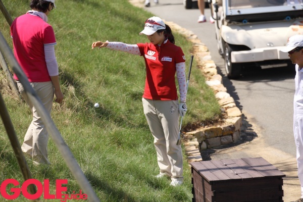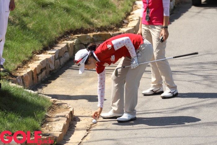 대회 1라운드 6번홀에서 김혜윤이 카트도로에 올라간 공을 잔디 위로 드롭하고 있다.