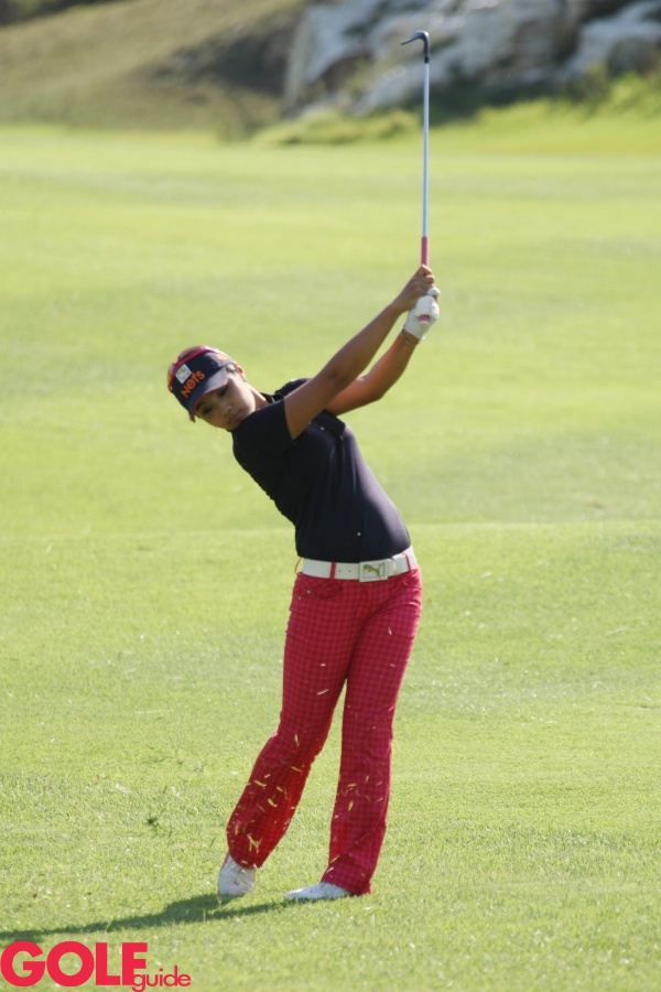 `2012 한화 금융 클래식` 대회 1라운드 18번홀에서 양수진이 화려하게 세컨샷을 하고 있다.